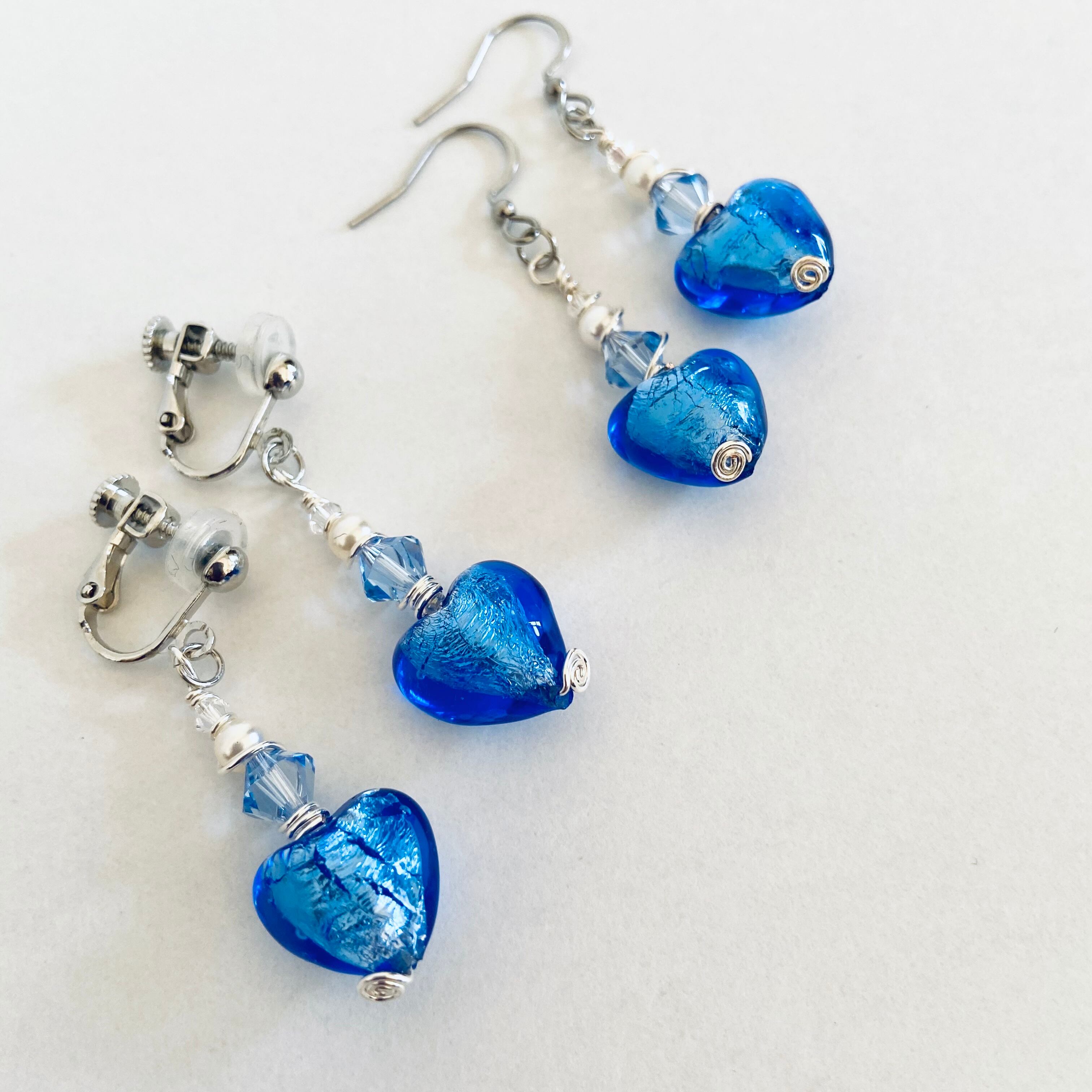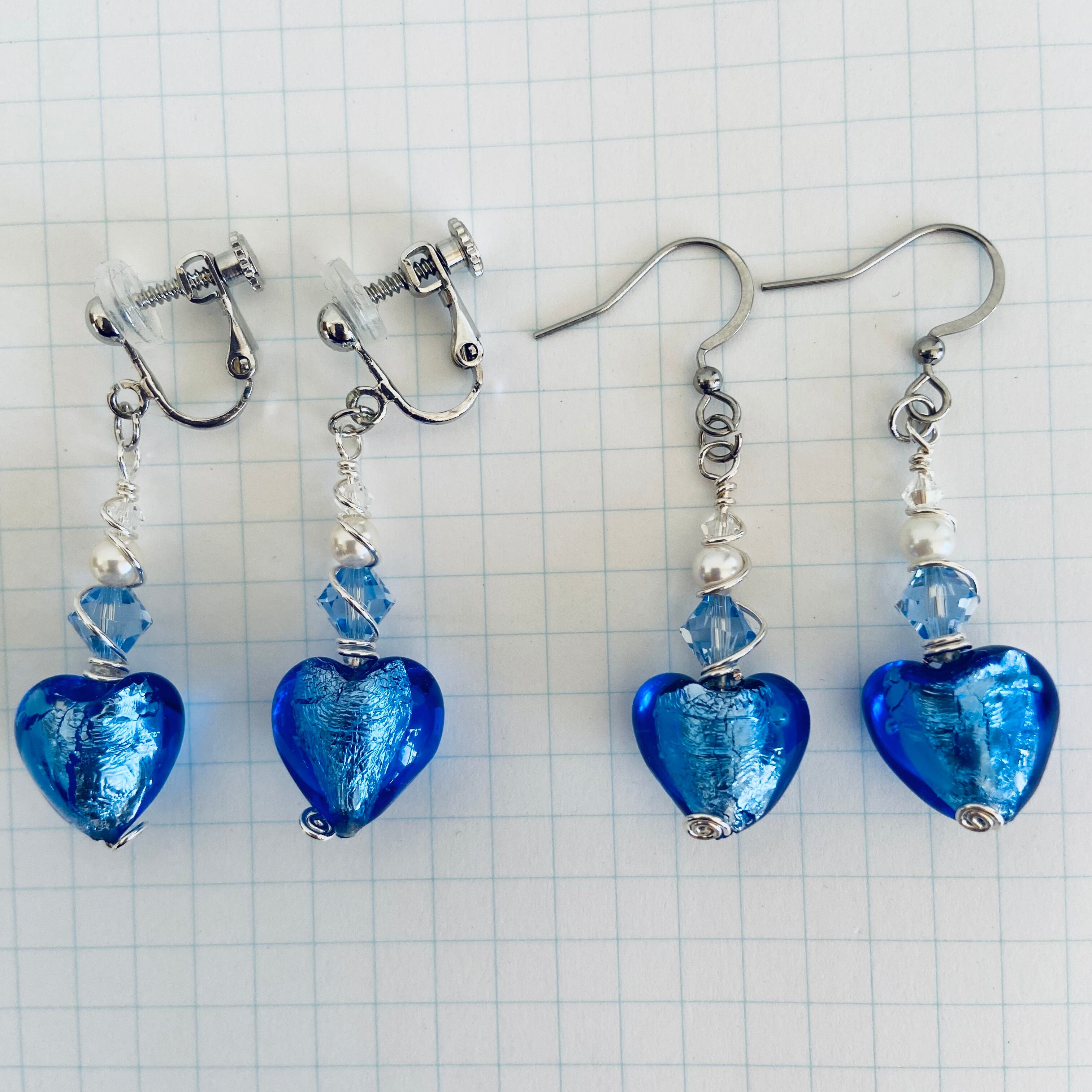 ハート型ベネチアンビーズ(青)、スワロフスキークリスタル、スワロフスキーパール、ワイヤー(銅線に18金メッキ)、作りかたレシピ