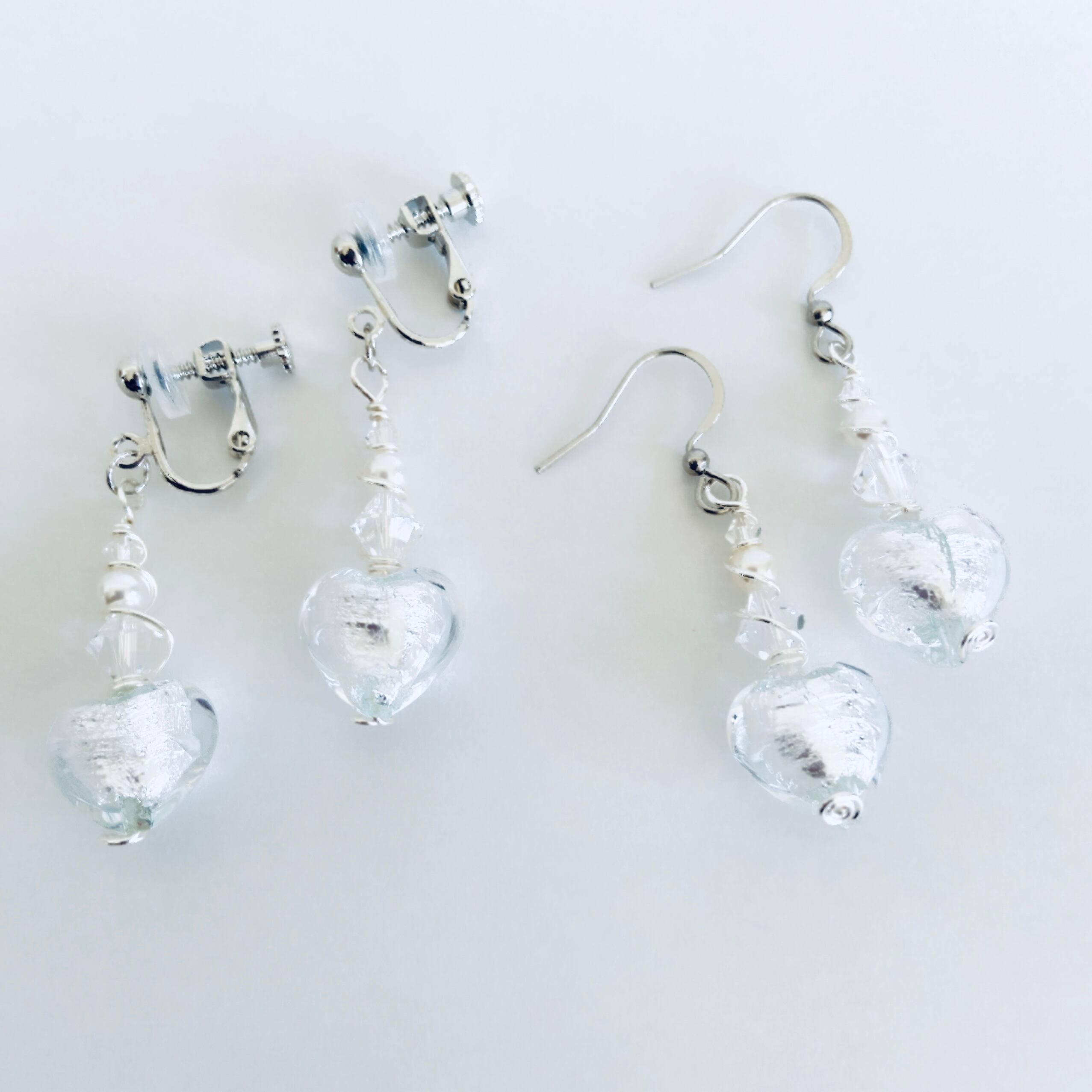 ハート型ベネチアンビーズ(白)、スワロフスキークリスタル、スワロフスキーパール、ワイヤー(銅線にシルバー925メッキ)
